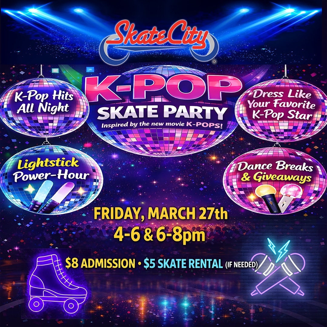 Get ready for the ultimate K-Pop Skate Party at Skate City on Friday, March 27th. Skate to K-Pop hits all night long during our 4–6pm and 6–8pm sessions, dress like your favorite K-Pop star, and don’t miss our Lightstick Power Hour, dance breaks, and giveaways. Admission is just $8 with $5 skate rental if needed — so grab your crew and hit the rink for a night full of music, lights, and nonstop energy.