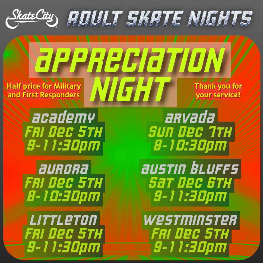 Join us for Adult Skate Appreciation Night as we honor Military and First Responders with half-price admission!