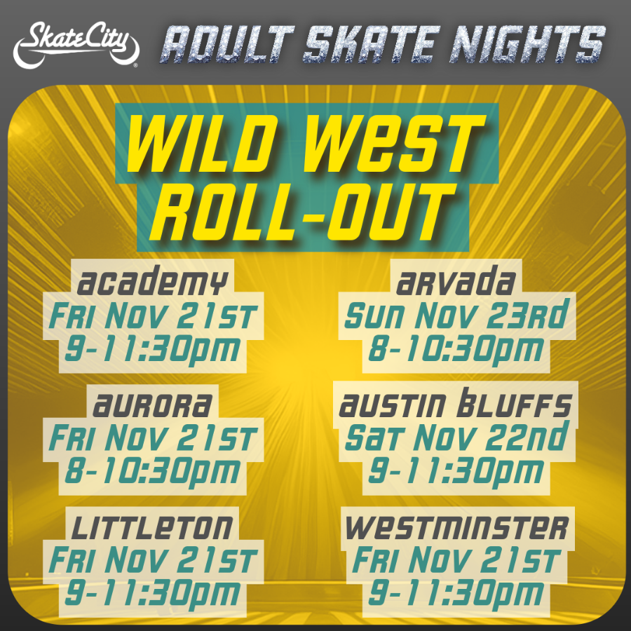 Saddle up and roll out for the Wild West Roll-Out Adult Skate Nights at Skate City! It’s time to bring your country style to the rink for one unforgettable night.