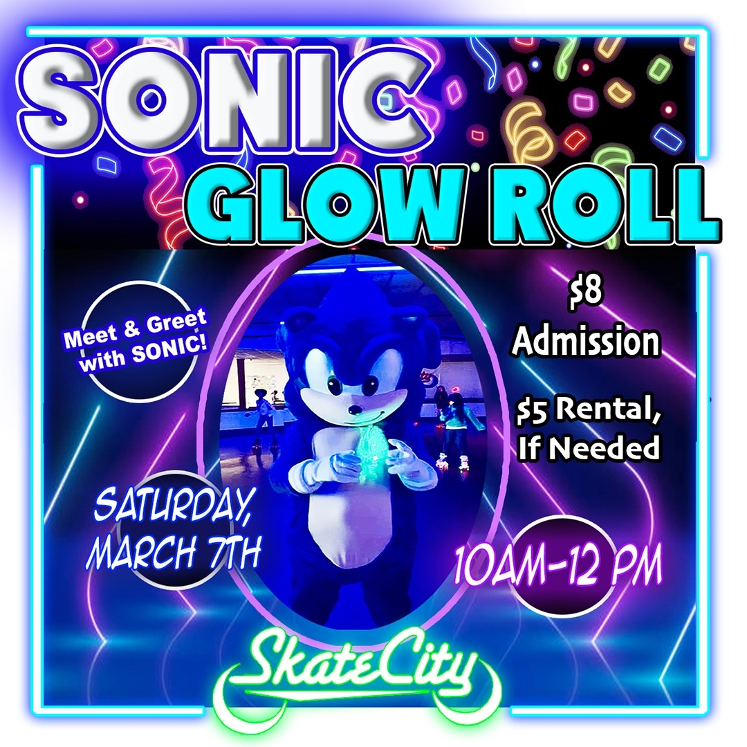 Light up the rink at our Sonic Glow Roll on Saturday, March 7th from 10am–12pm. Meet and greet Sonic, skate under the neon lights, and enjoy a high-energy glow session perfect for families and young fans. Admission is $8, with $5 skate rental available if needed. Don’t miss this bright, fast-paced morning of glow-in-the-dark fun at Skate City.