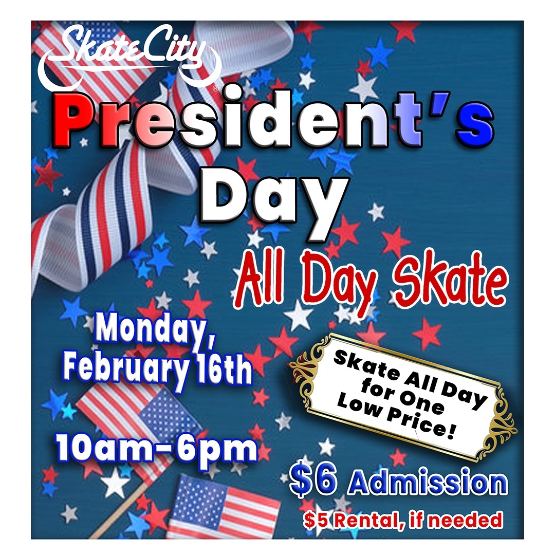 Celebrate President’s Day with an All Day Skate at Skate City on Monday, February 16th. We’ll be open from 10am–6pm, giving families plenty of time to skate throughout the day. Admission is just $6, with skate rental available for $5 if needed. It’s an easy, affordable way to enjoy the holiday with nonstop skating fun.