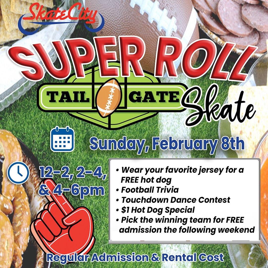 Get ready for game day fun at Skate City during our Super Roll Tailgate Skate on Sunday, February 8th. Skate during one of three sessions from 12–2pm, 2–4pm, or 4–6pm and enjoy a full lineup of football-themed activities. Wear your favorite team jersey to score a free hot dog, test your knowledge with football trivia, and show off your moves in the touchdown dance contest. Admission is $8 per skater with $5 skate rental (if needed).