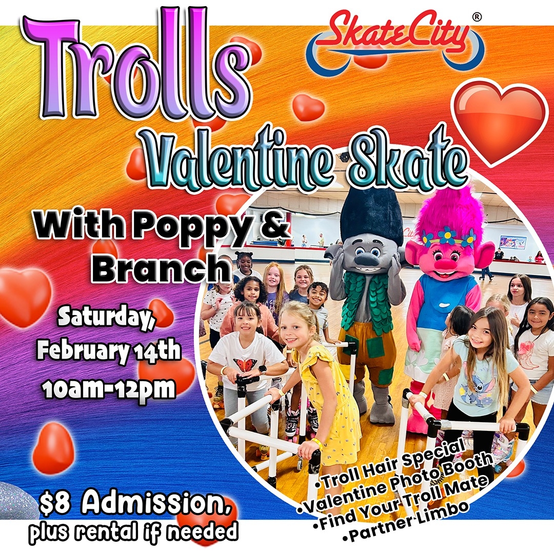 Celebrate Valentine’s Day with a colorful morning of skating fun at Skate City during our Trolls Valentine Skate with Poppy & Branch on Saturday, February 14th from 10am–12pm. Kids can skate with Poppy and Branch, snap photos at the Valentine photo booth, and enjoy special Troll-themed activities like Troll Hair fun and Partner Limbo. Admission is $8 per skater with $5 skate rental (if needed).
