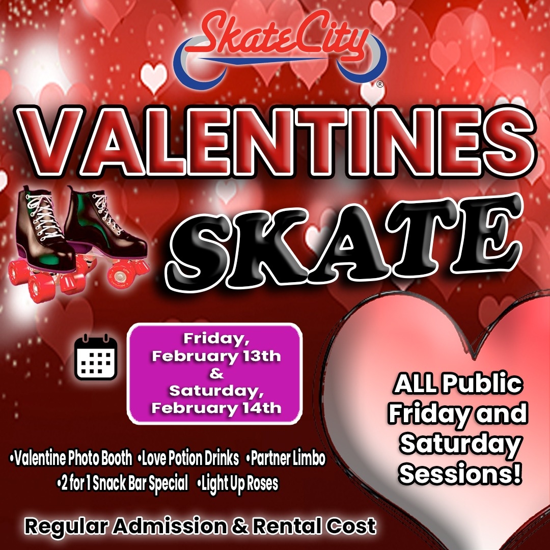 Celebrate Valentine’s Day on wheels at Skate City during our Valentine’s Skate on Friday, February 13th & Saturday, February 14th. All public skating sessions on both days will feature festive Valentine fun, including a Valentine photo booth, love potion drinks, and a partner limbo. Enjoy snack bar specials, light-up roses, and plenty of reasons to skate with someone special. Admission is $8 per skater with $5 skate rental (if needed).